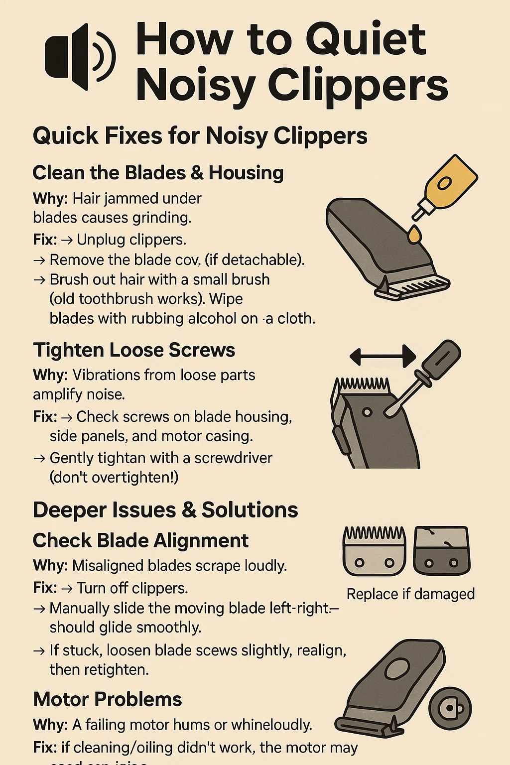 Betulkan: → Jika pembersihan/minyak tidak berfungsi, motor mungkin memerlukan servis. → Untuk gunting yang lebih tua, pertimbangkan untuk menggantikan berus karbon (jika berkenaan).