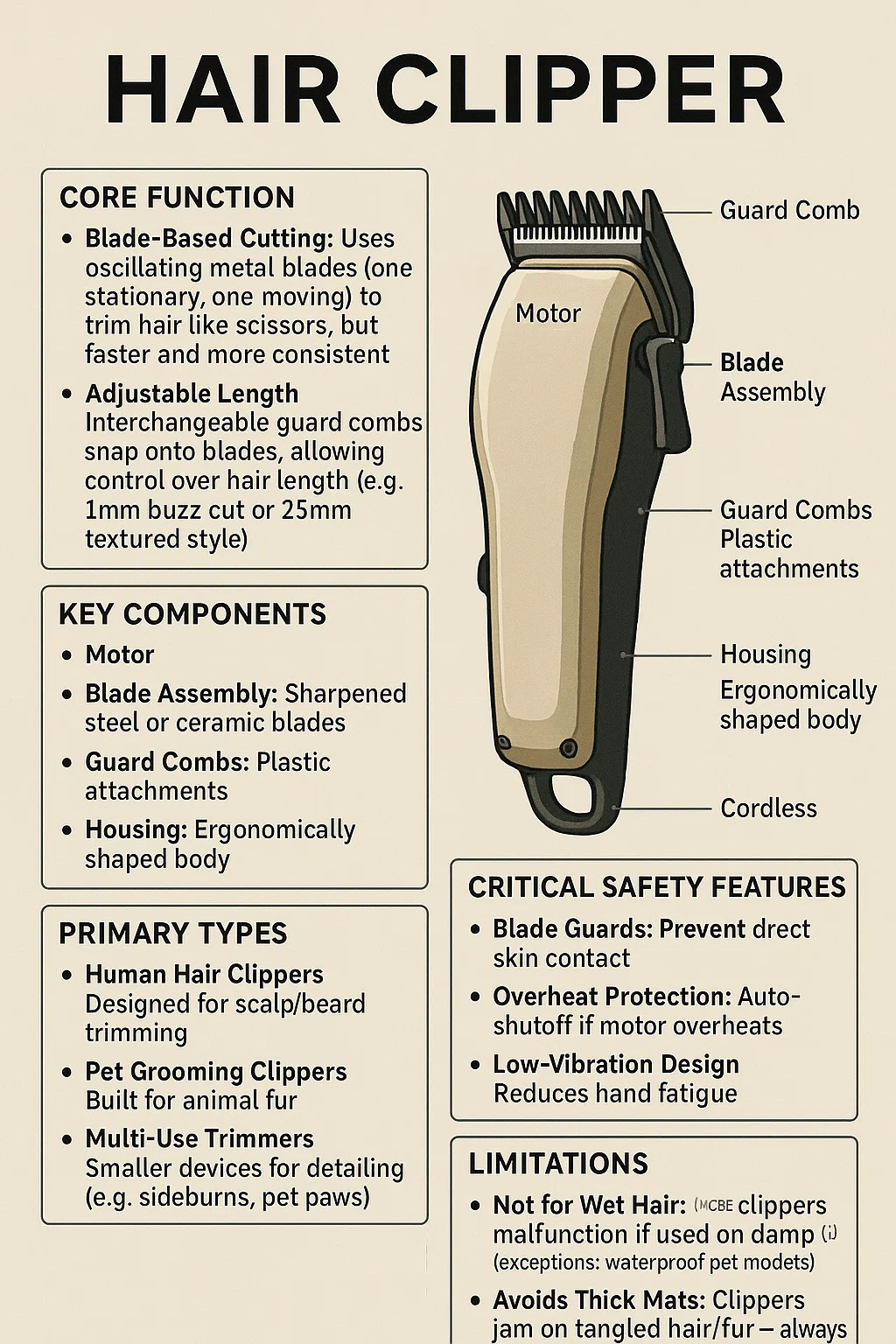 A Clipper rambut adalah alat dandanan elektrik yang direka untuk memotong rambut dengan cekap dan seragam. Berikut adalah pecahan terperinci mengenai ciri dan kegunaan terasnya: